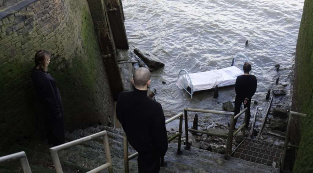 At the center of the work, a bed is placed on the riverbed. Over the course of five hours, the water level of the Thames rises by up to seven meters, progressively flooding the bed. Housing appears here not as shelter, but as an unstable and increasingly unattainable condition, exposed to forces beyond individual control.